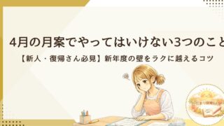 4月の月案作成に悩む新人・復帰保育士さん必見!ついやってしまいがちなNG例3選と、スムーズに新年度をスタートさせるためのコツを解説します。20年の経験を凝縮した「年間セット」を活用して、書類の時間を最小限に、子どもと向き合う時間を最大限にする方法をご紹介。